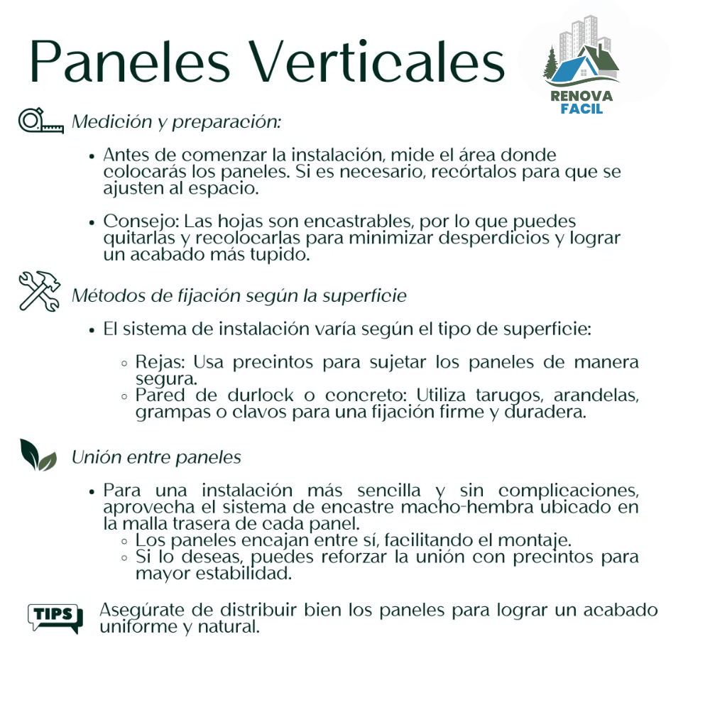 Recomendamos colocarlo sobre fondos oscuros para disimular los pequeños espacios entre las hojas y lograr un acabado más uniforme. Este modelo se diferencia del Jardín Vertical Deseado por sus hojas más largas, que le dan un aspecto más llamativo y frondoso.